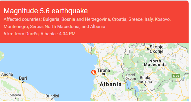 Brenda 11 minutave, dy tërmete të fuqishme goditën Shqipërinë, pasditen e së shtunës. Përveç në Shqipëri, dridhjet u dëgjuan edhe në Kosovë, Bullgari, Bosnje, Kroaci, Greqi, Itali, Serbi, Maqedoni të Veriut e në Mal të Zi.