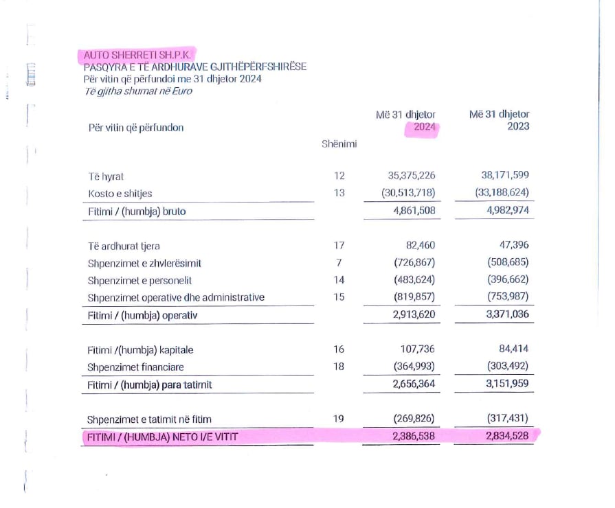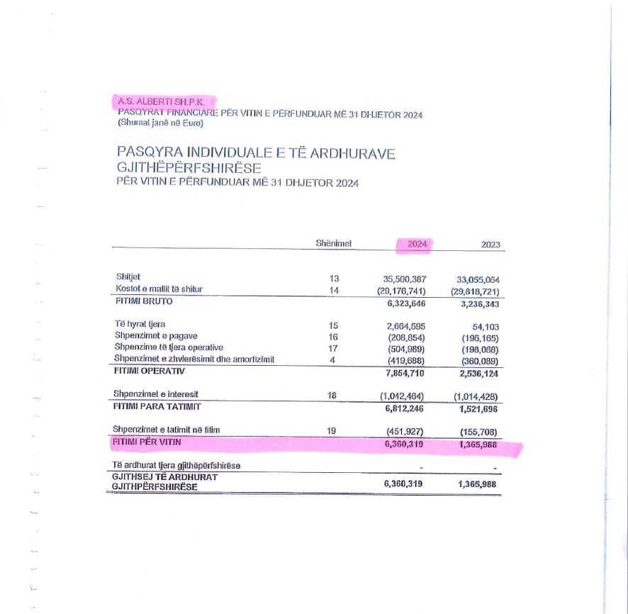 Sipas pasqyrave financiare të Autosallonit “Alberti” për vitin 2024, kjo e fundit kishte deklaruar shitje vjetore në vlerë prej 35.5 milionë euro, përderisa fitimi neto për vitin 2024 kishin qenë hiç më pak se 6.4 milionë euro.