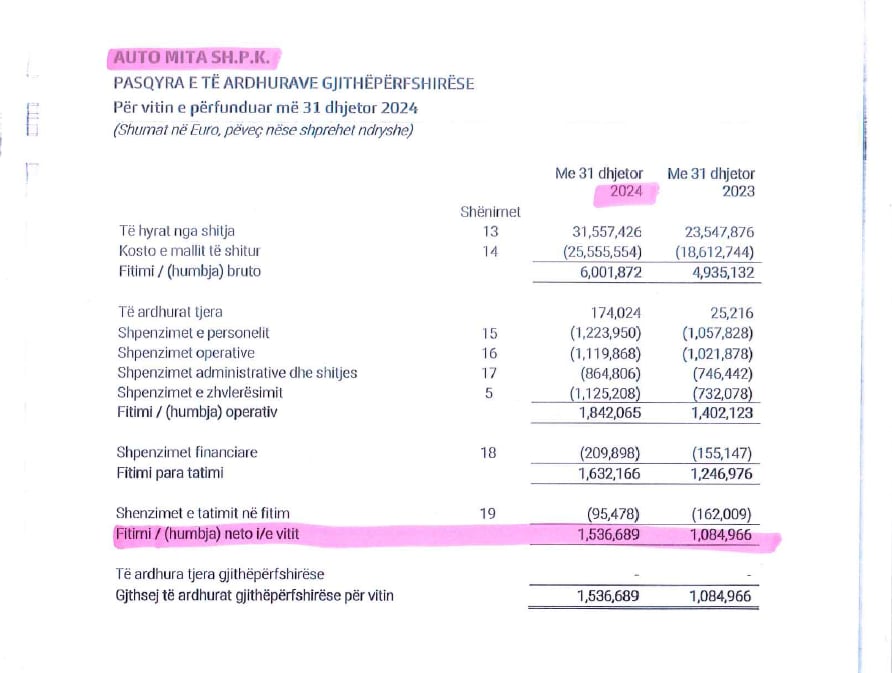 Ndërsa “Automita”, e cila është përfaqësues zyrtar për Kosovë dhe Shqipëri i veturave Renault, Nissan, Dacia dhe Volvo, gjatë vitit 2024 ka pasur qarkullim prej 31.5 milionë euro, ndërsa fitimi neto i deklaruar ka qenë 1.53 milionë euro.