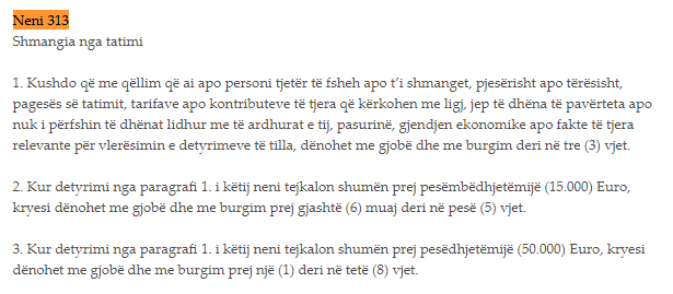 Ndryshe, shmangia nga tatimi dënohet edhe me Nenin 313 të Kodit Penal të Republikës së Kosovës.