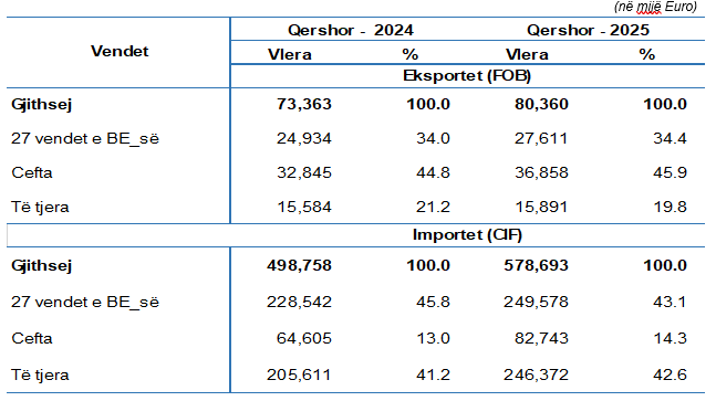 Gjatë qershorit 2025, vlera e eksporteve të mallrave nga Kosova arriti në 80,4 milionë euro, që paraqet një rritje prej 9,5% në krahasim me muajin qershor të vitit të kaluar. Nga ana tjetër, importet u rritën me 16%, duke arritur vlerën 578,7 milionë euro.