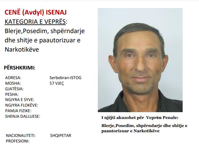 Policia Rajonale e Pejës po kërkon ndihmën e qytetarëve për arrestimin e një të kërkuari për blerje, posedim, shpërndare dhe shitje të paautorizuar të narkotikëve. Bëhet fjalë për 57-vjeçarin nga Lubova e Istogut, Cenë Isenaj, raporton Express.