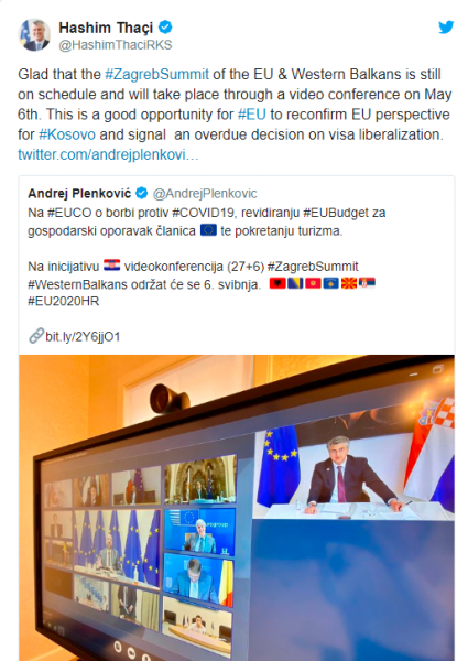 “I lumtur që Samiti i Zagrebit i BE-së dhe Ballkanit Perëndimor është akoma në planifikim dhe do të zhvillohet përmes një video-konference më 6 maj. Kjo është një mundësi e mirë për BE-në që të rikonfirmojë perspektivën e BE për Kosovën dhe të sinjalizojë një vendim të vonuar për liberalizimin e vizave”, ka shkruar presidenti Thaçi.